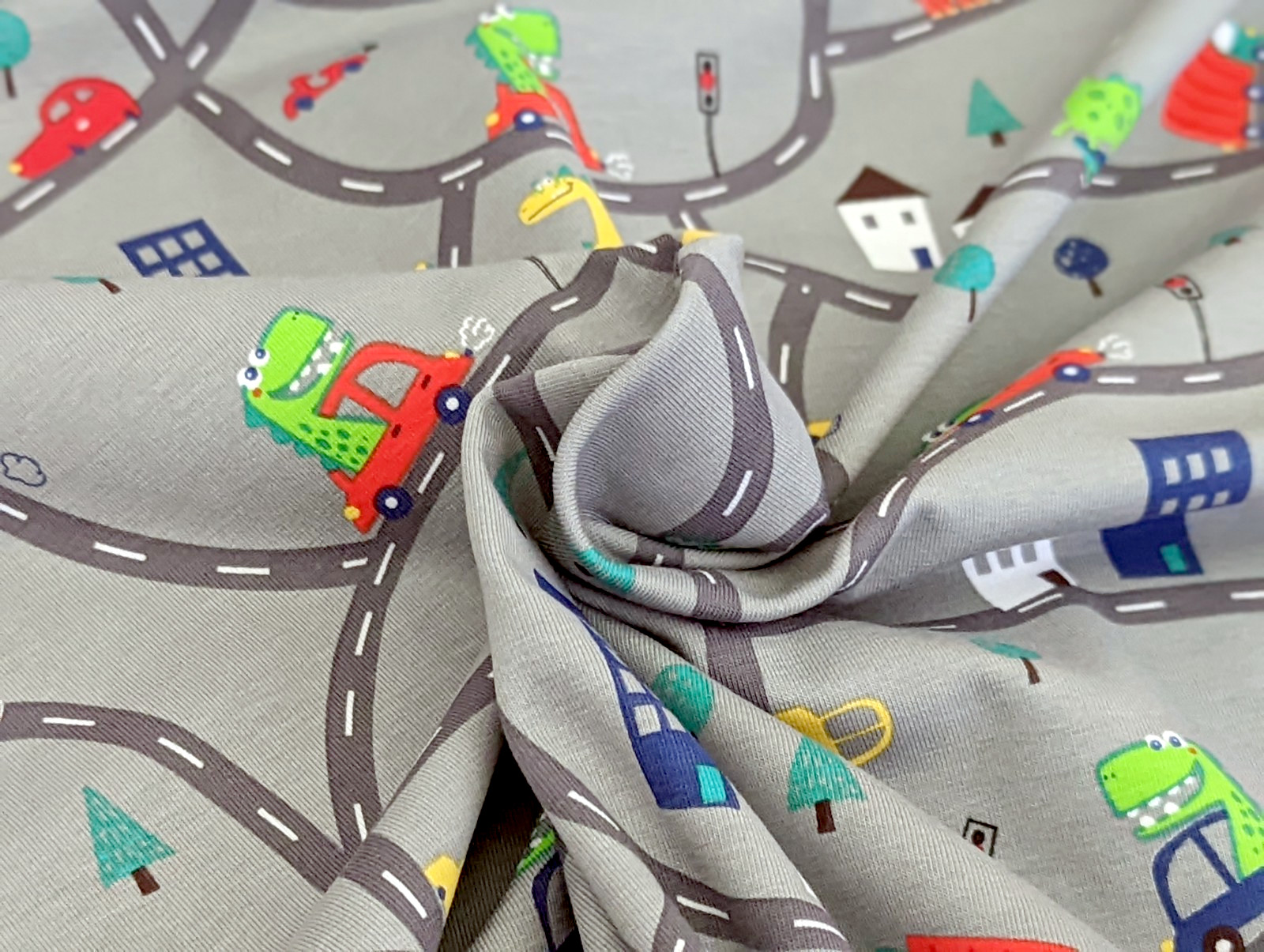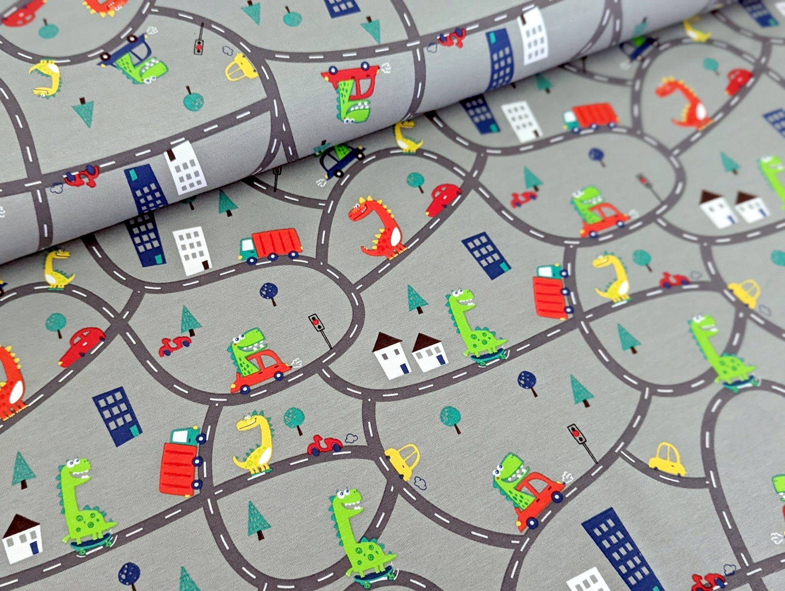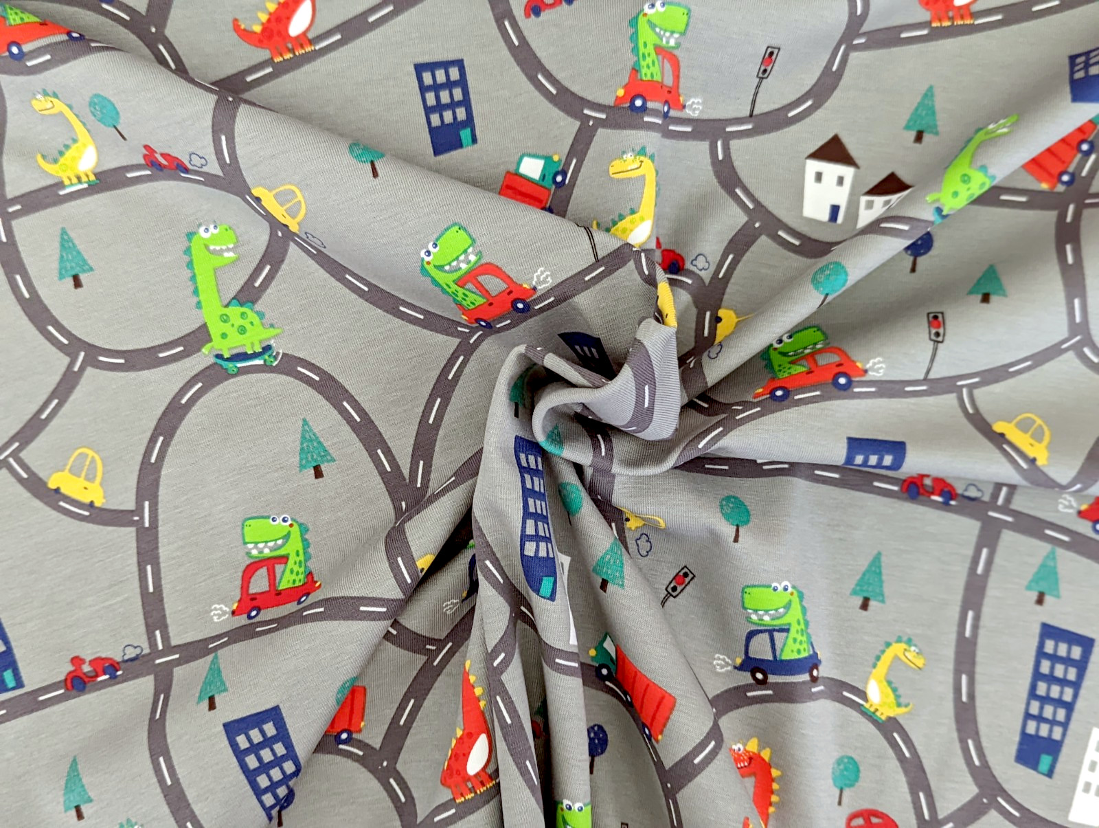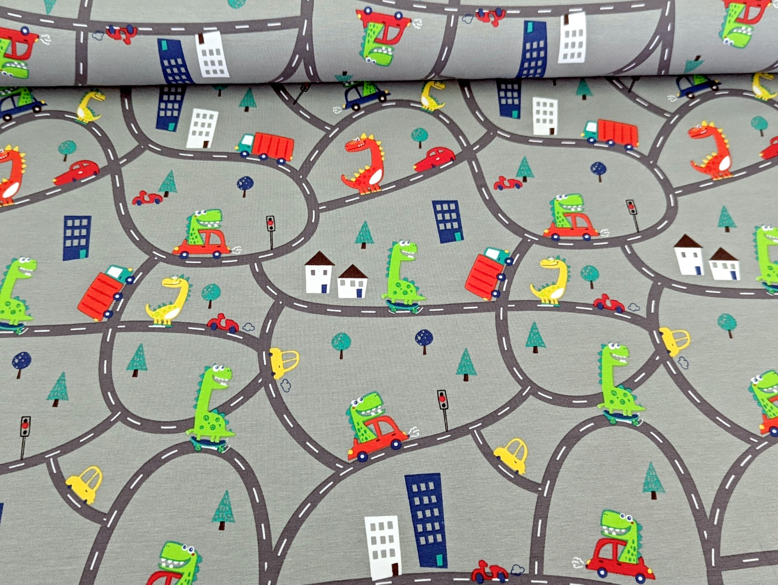 Baumwolljersey Dino im Auto auf der Straße Hellgrau