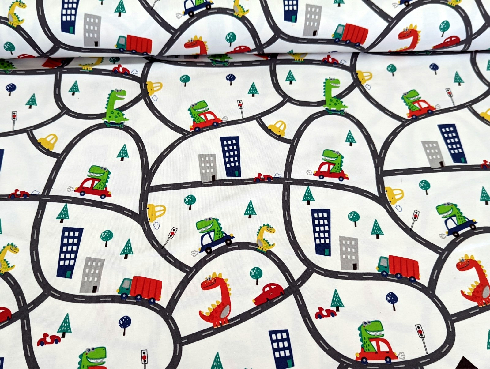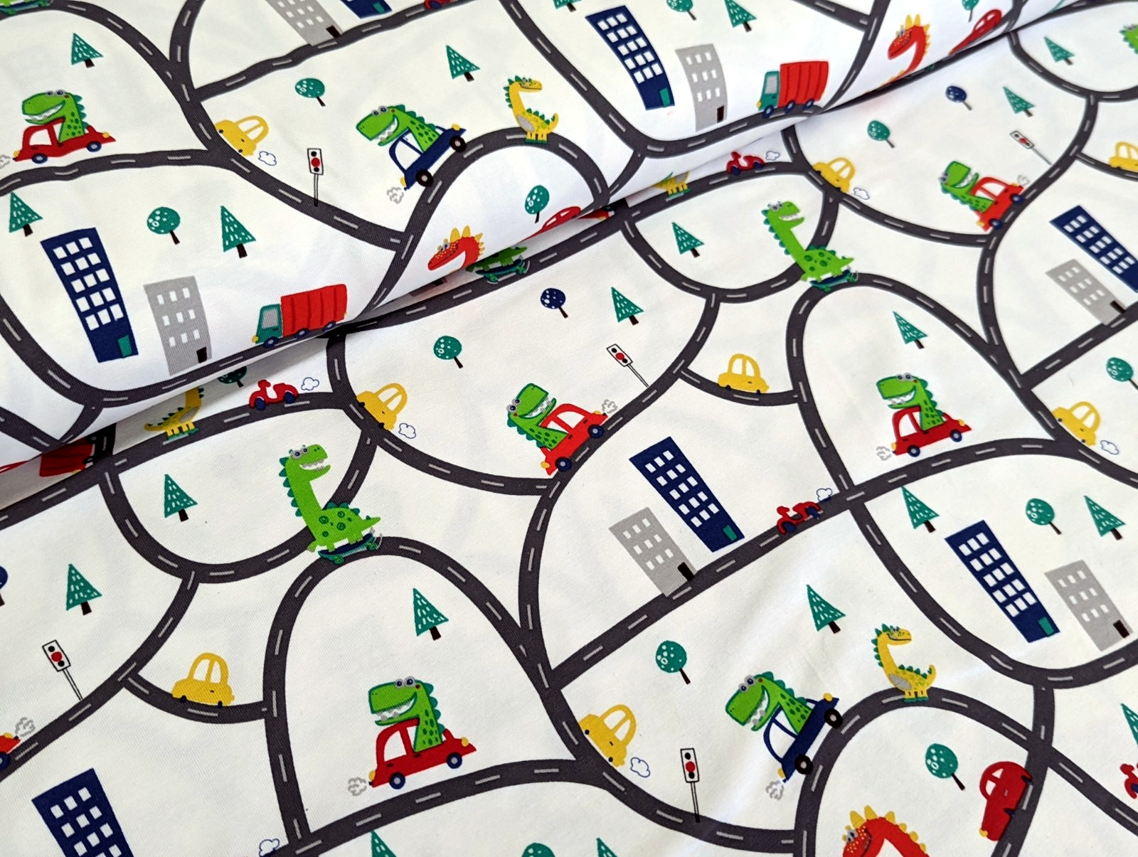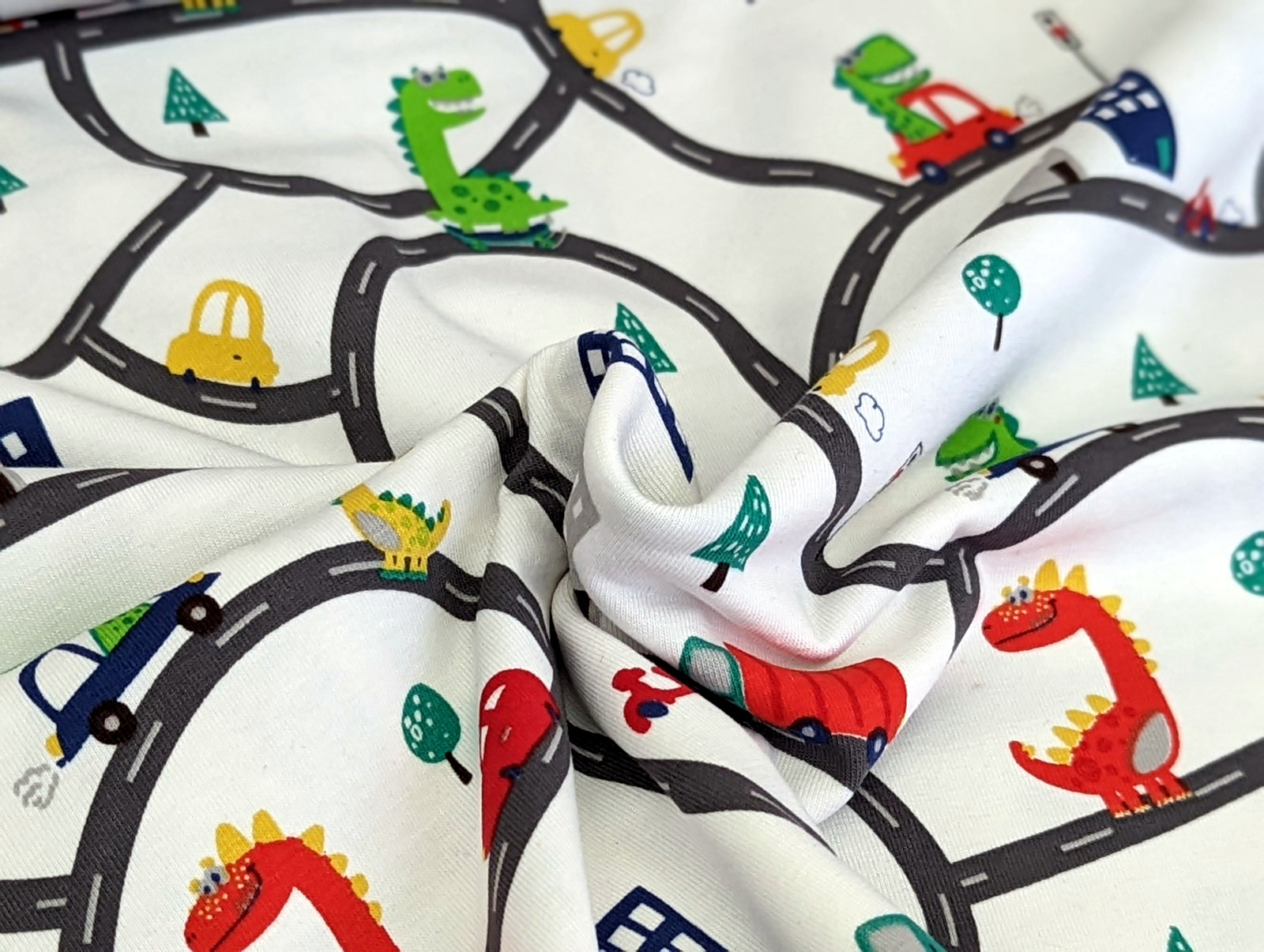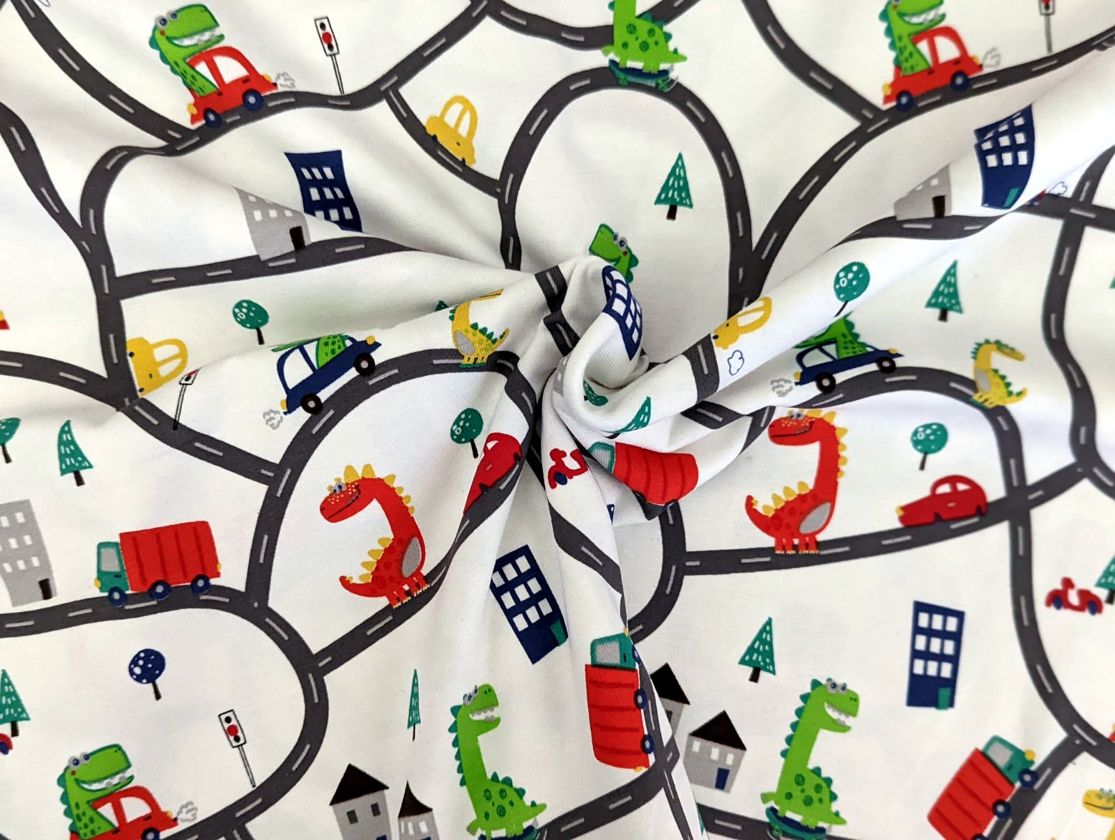 Baumwolljersey Dino im Auto auf der Straße Weiß
