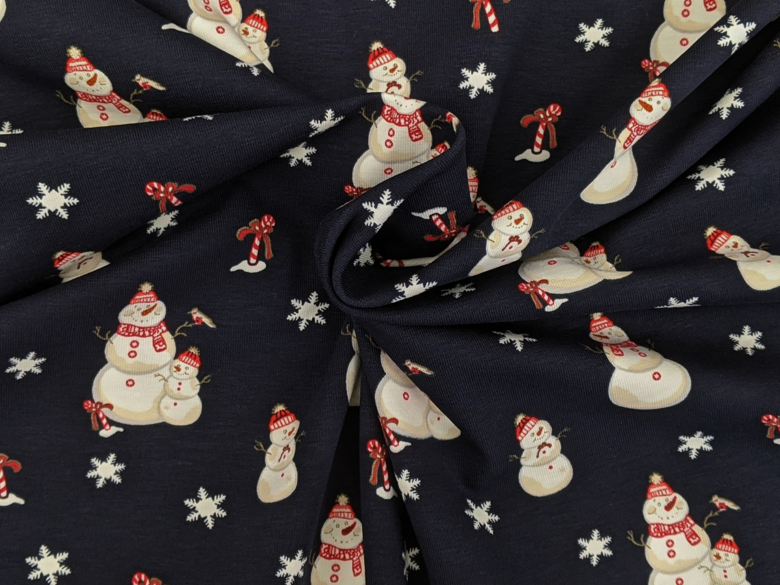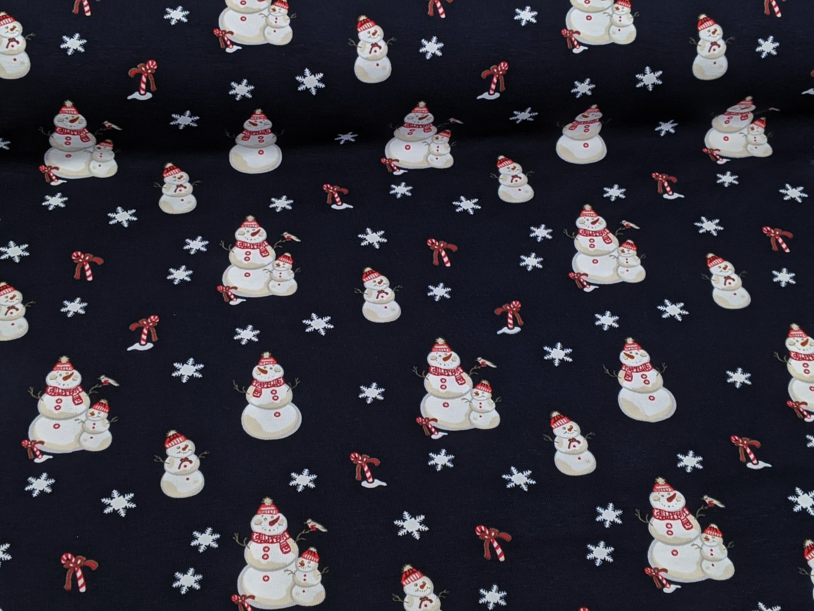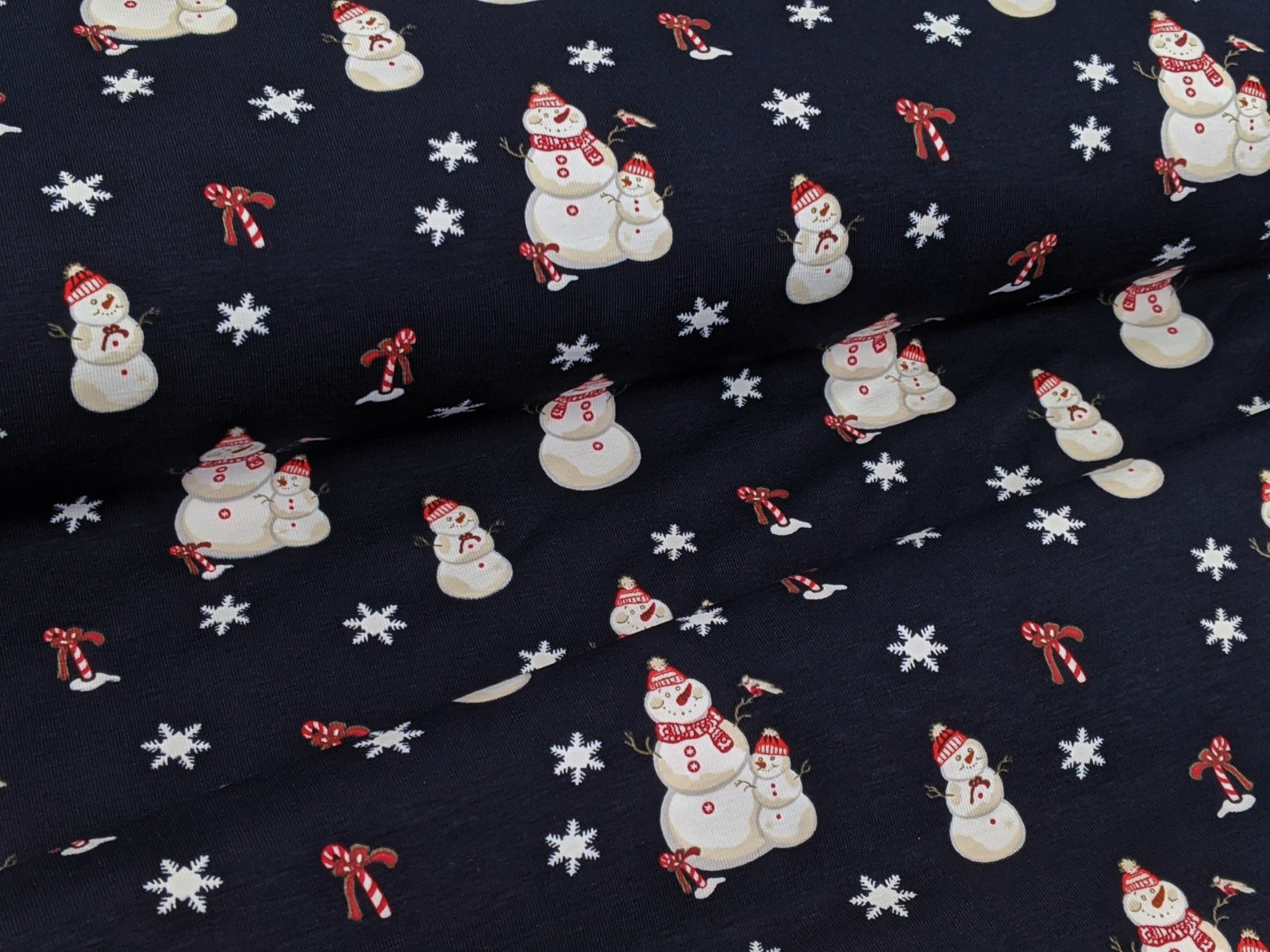 Baumwolljersey Familie Schneemann Schneeflocken Nachtblau