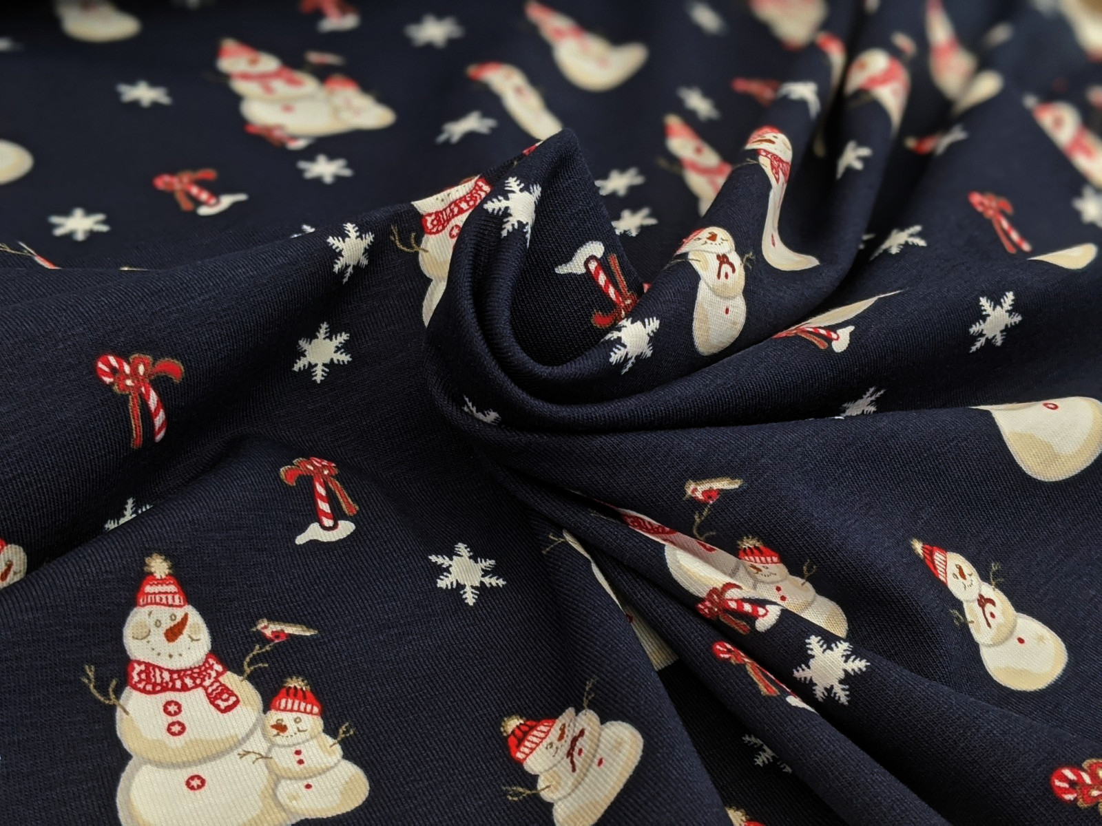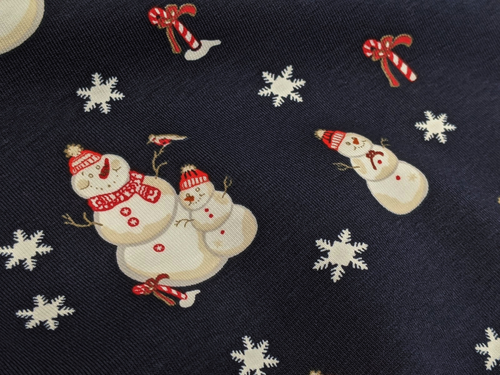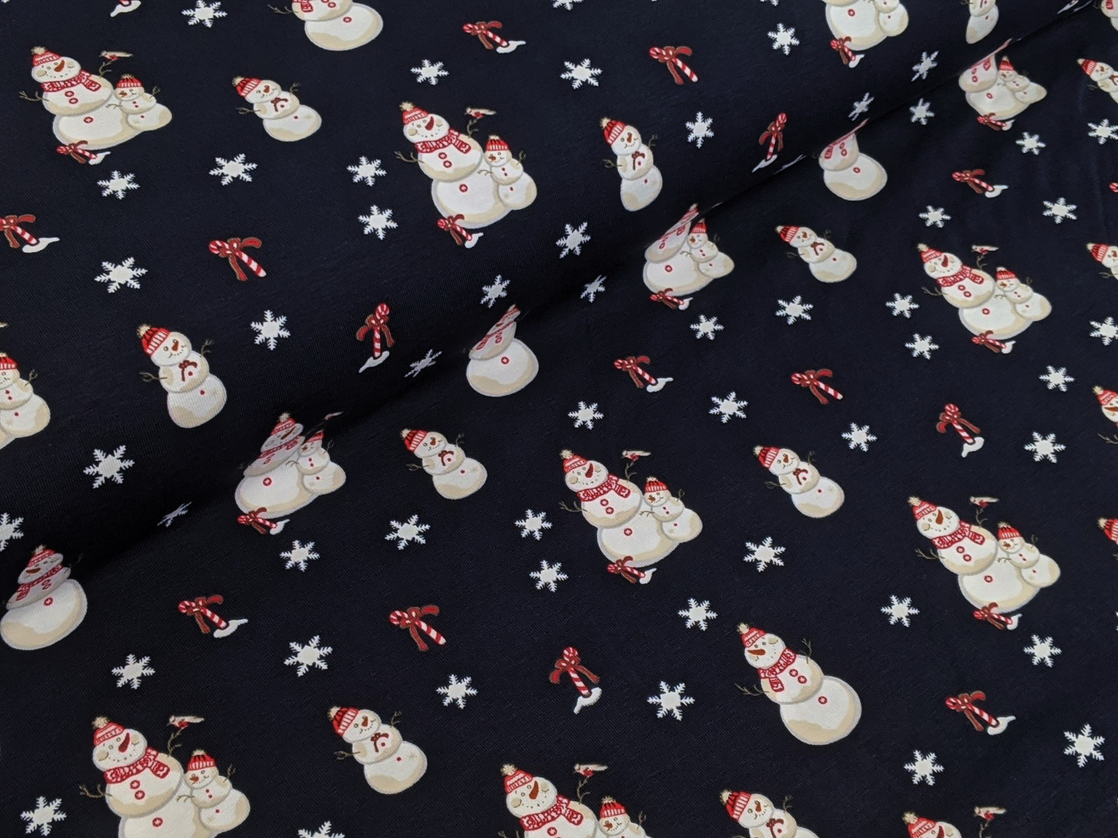 Baumwolljersey Familie Schneemann Schneeflocken Nachtblau