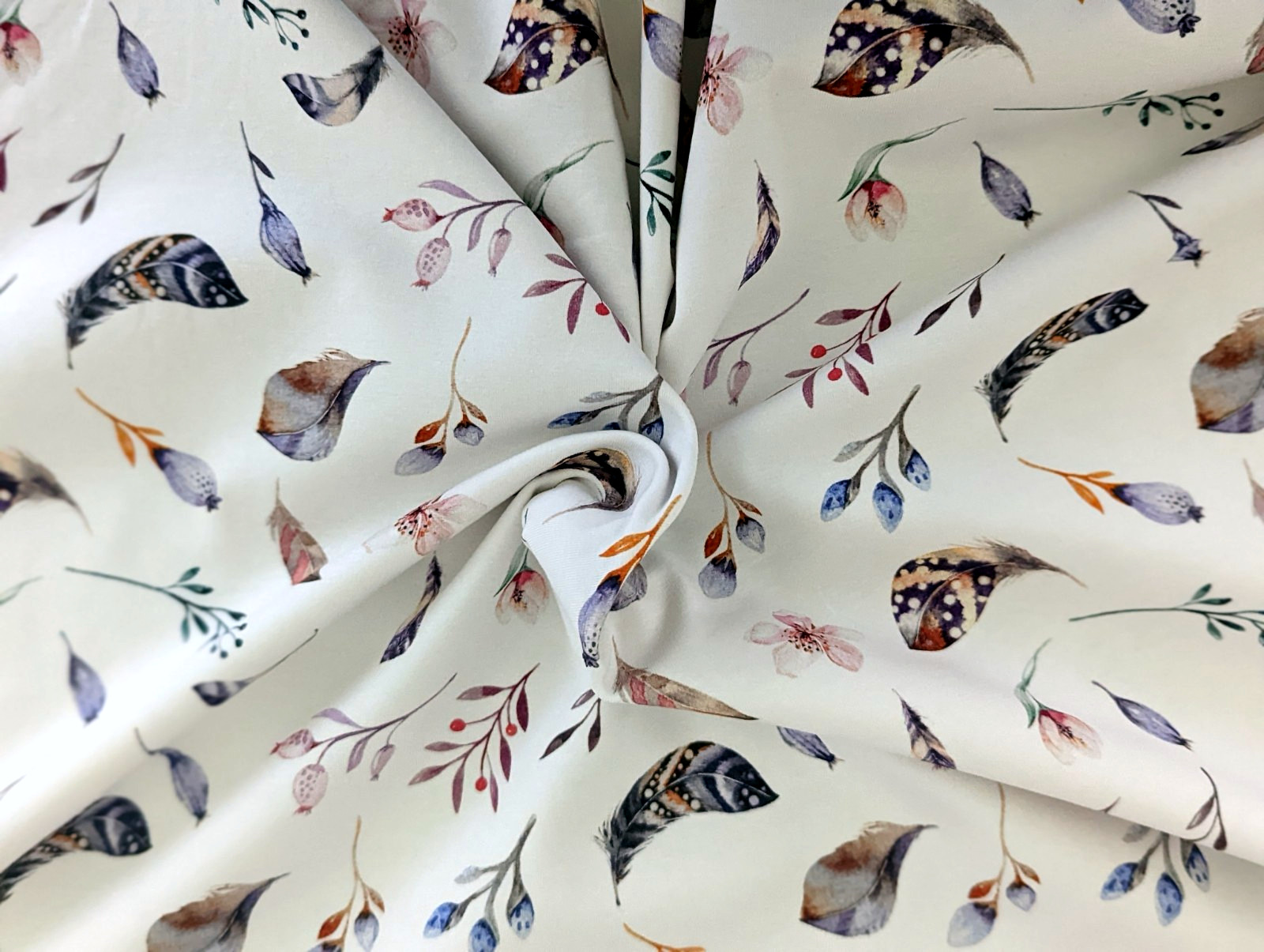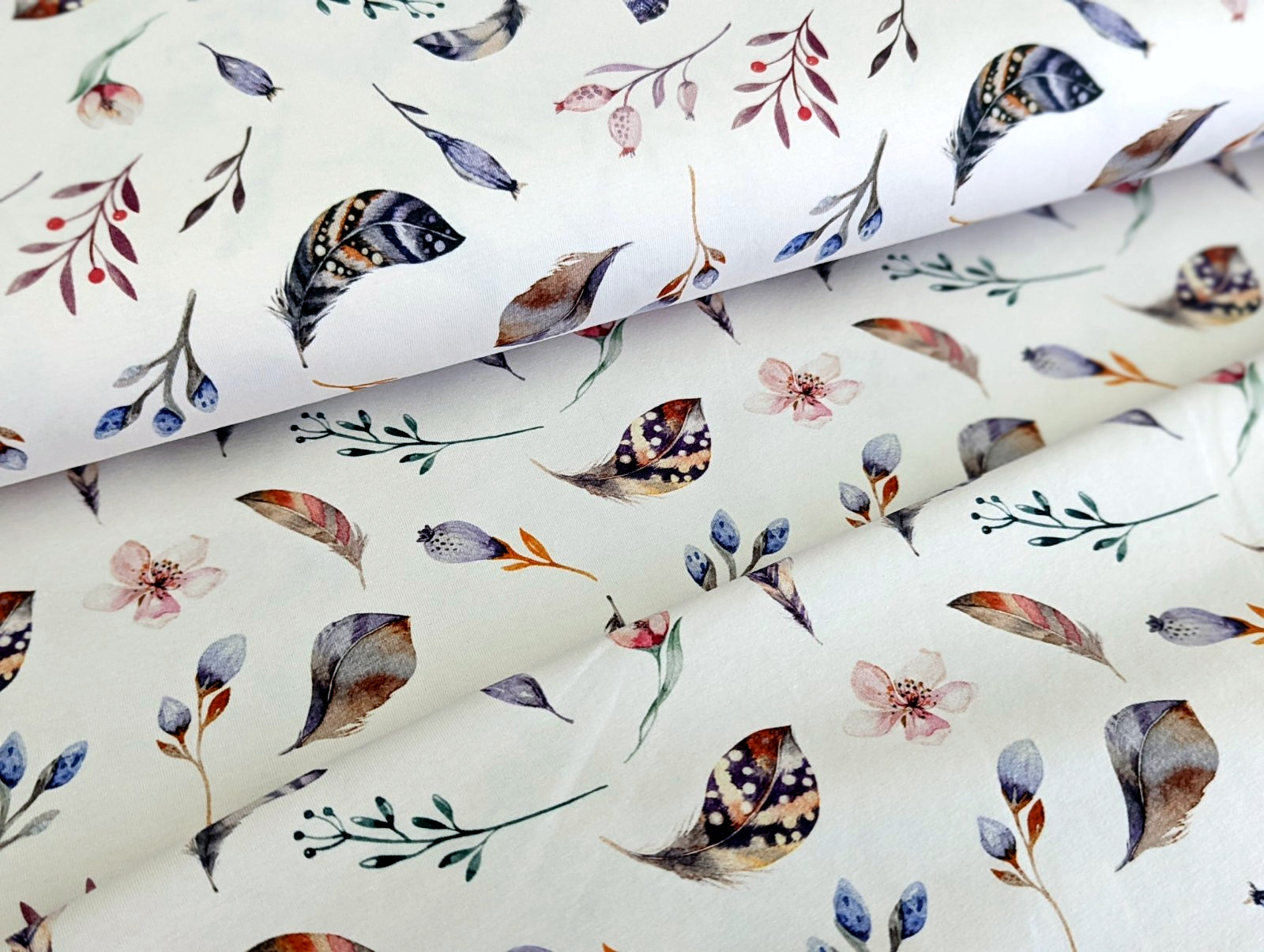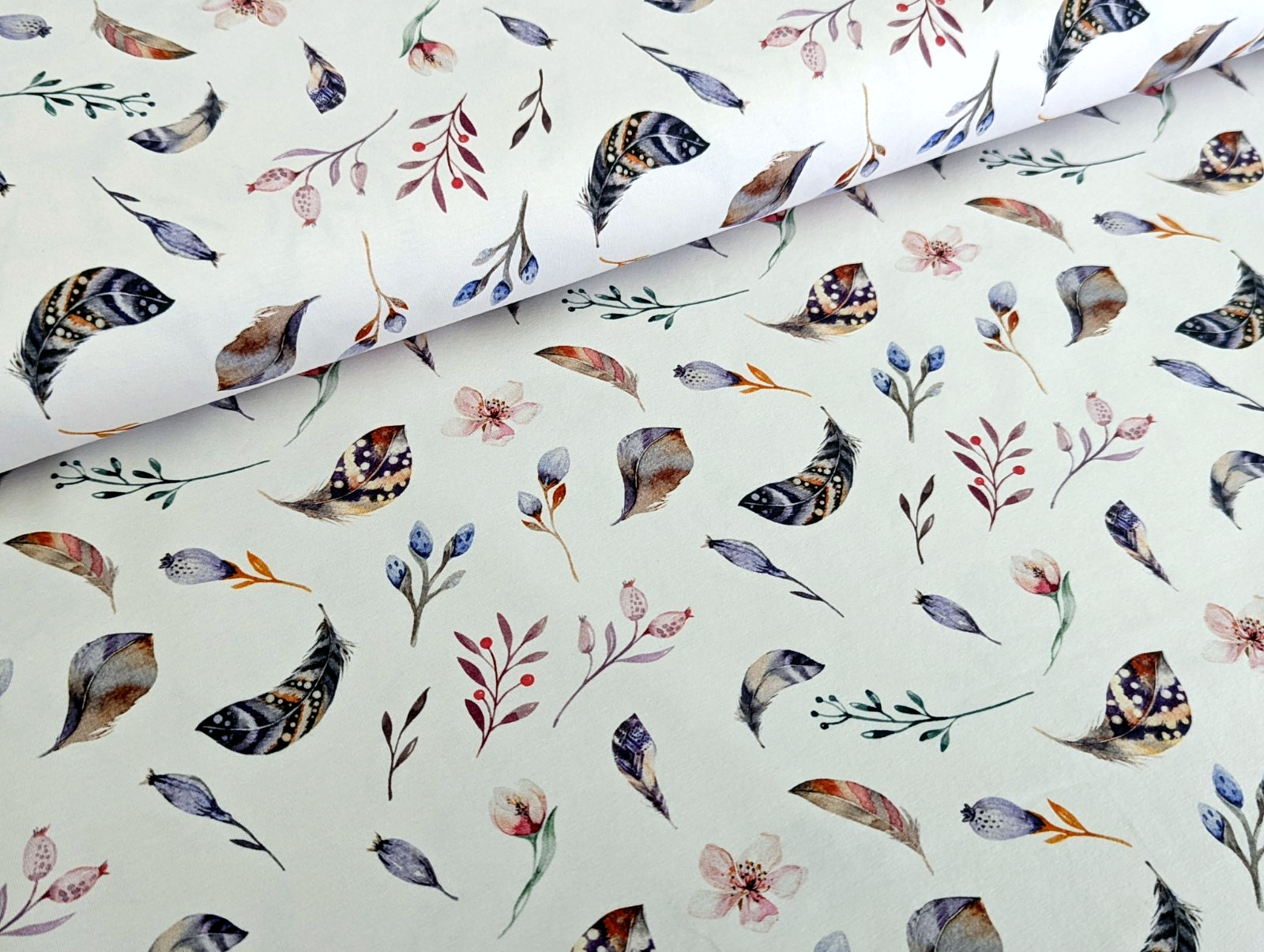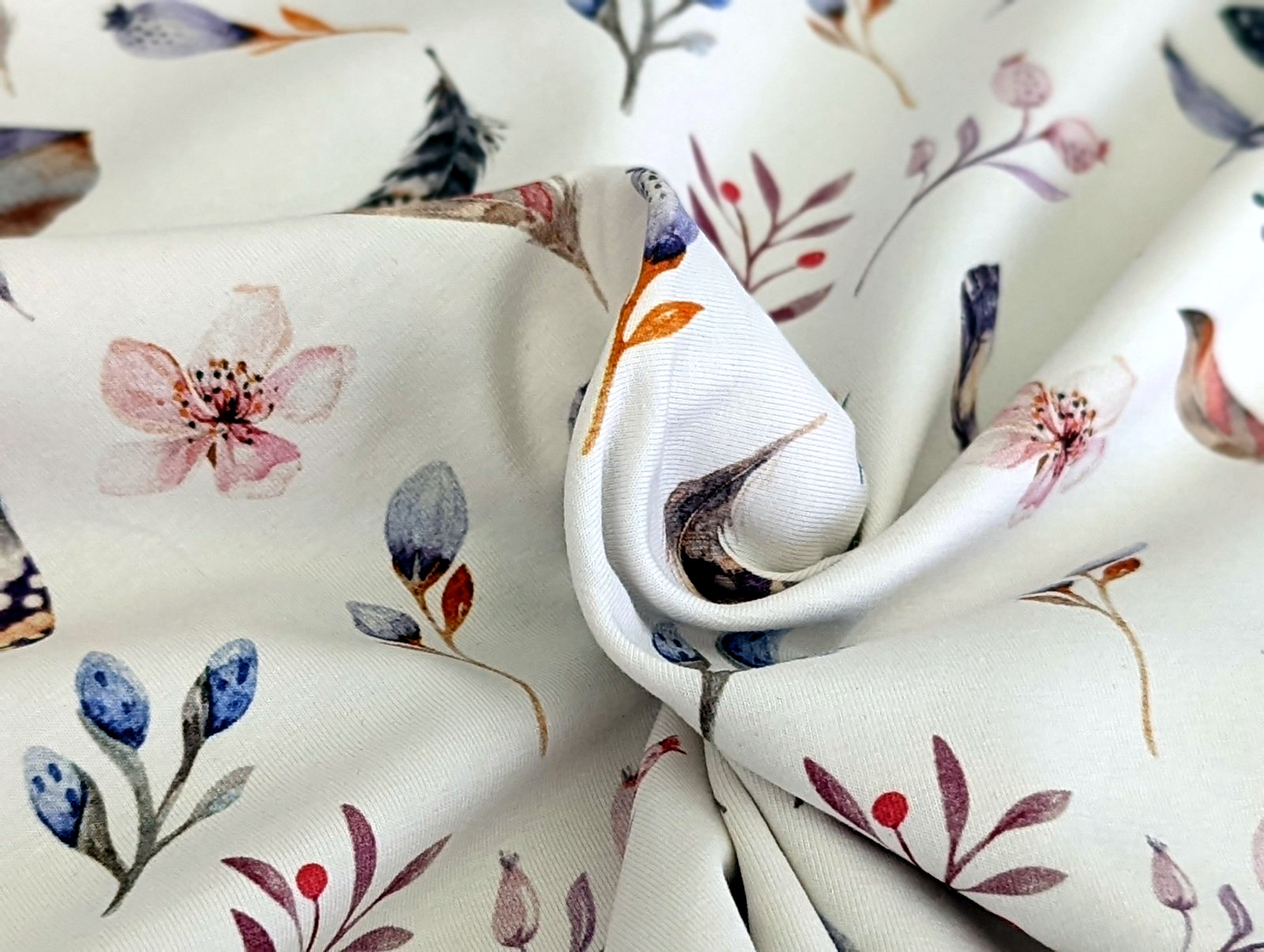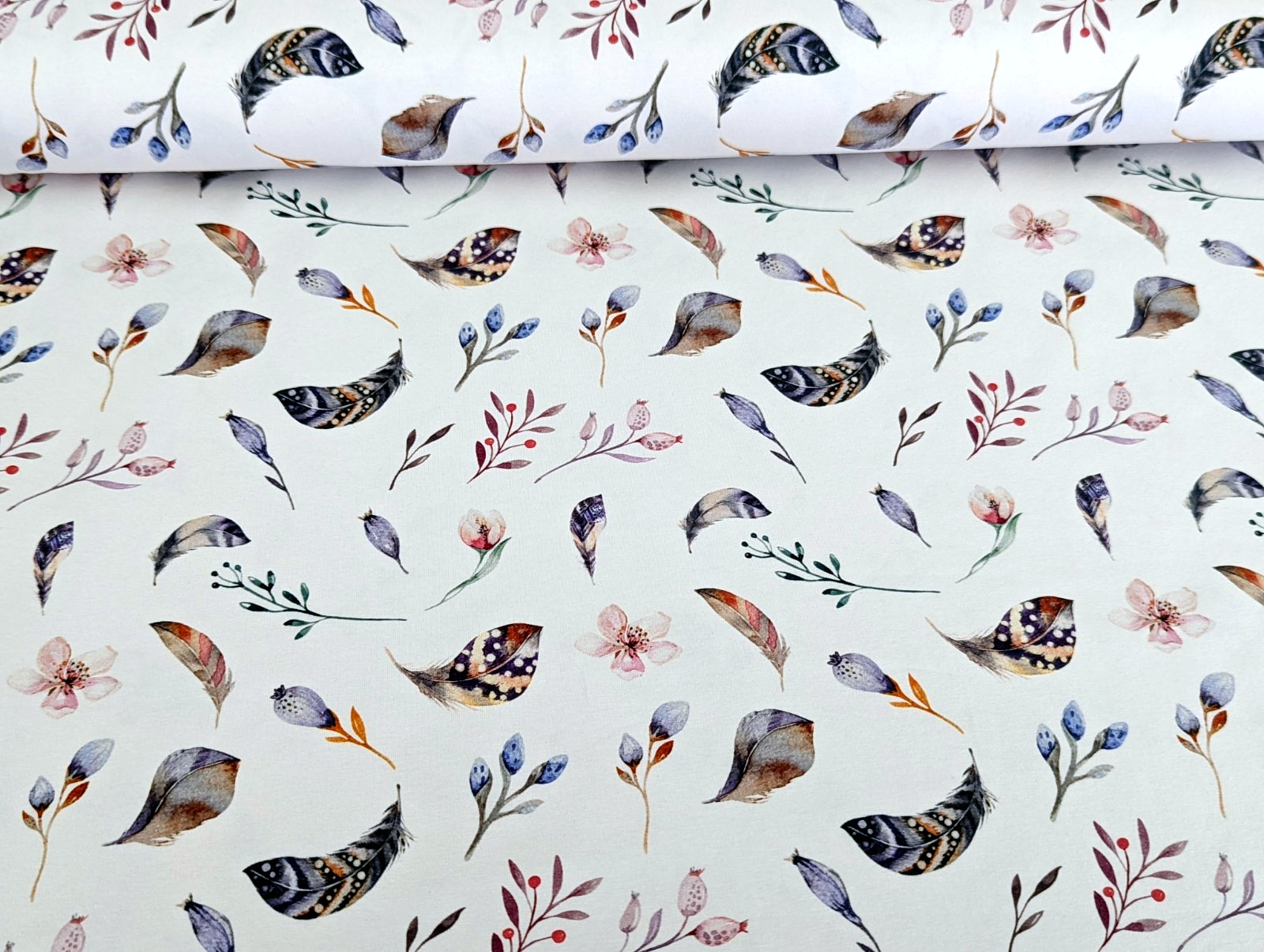 Baumwolljersey Kleine Federn Zweigen und Kirschblüten auf Cremeweiß