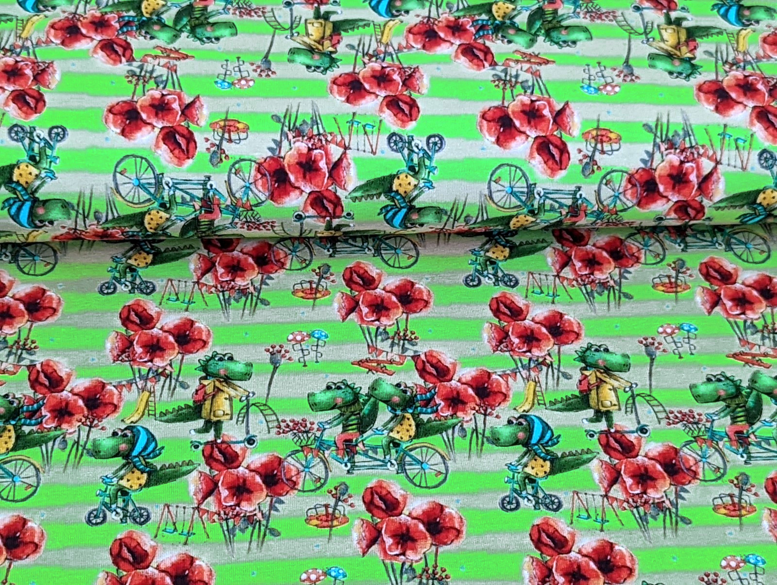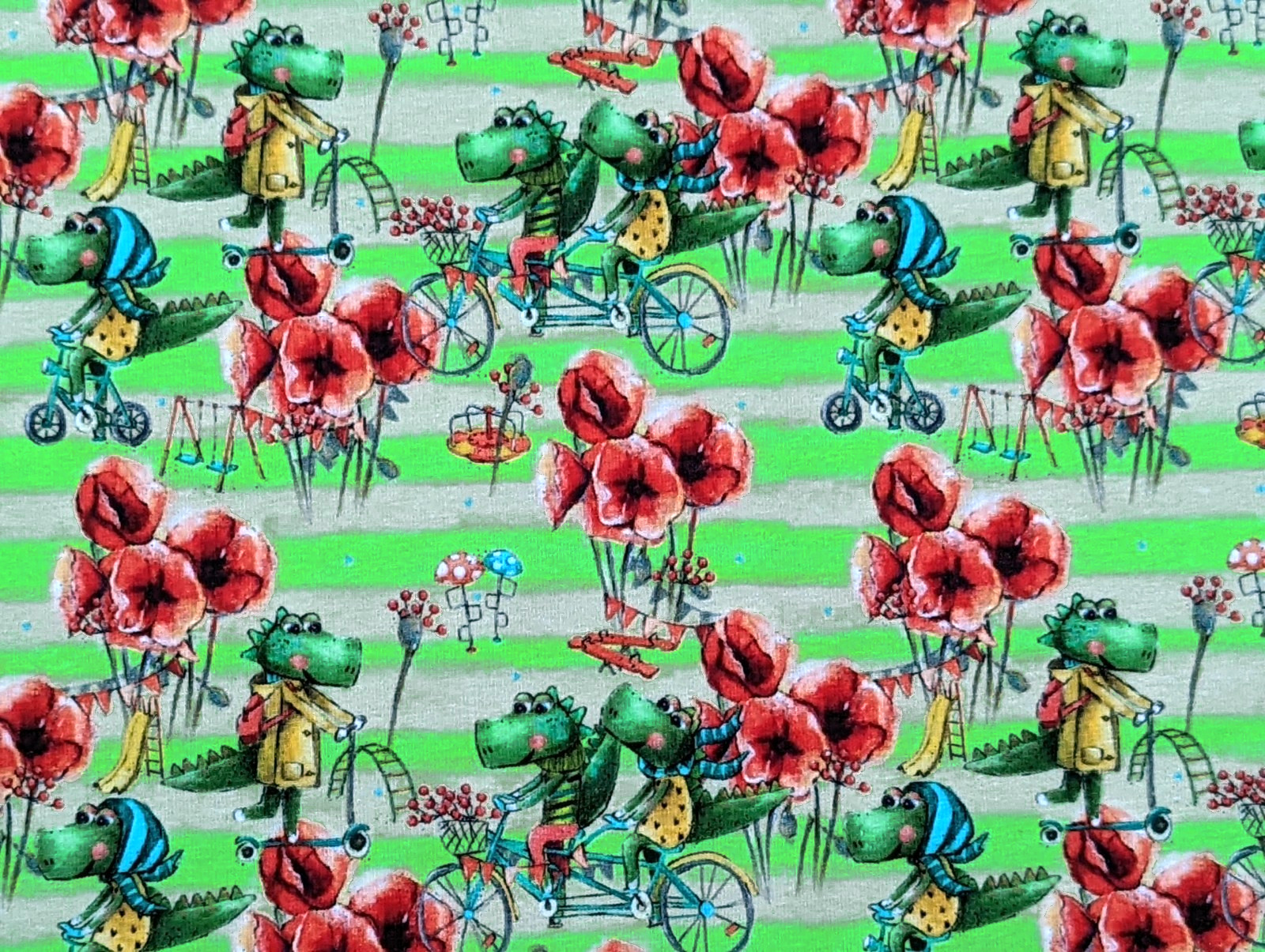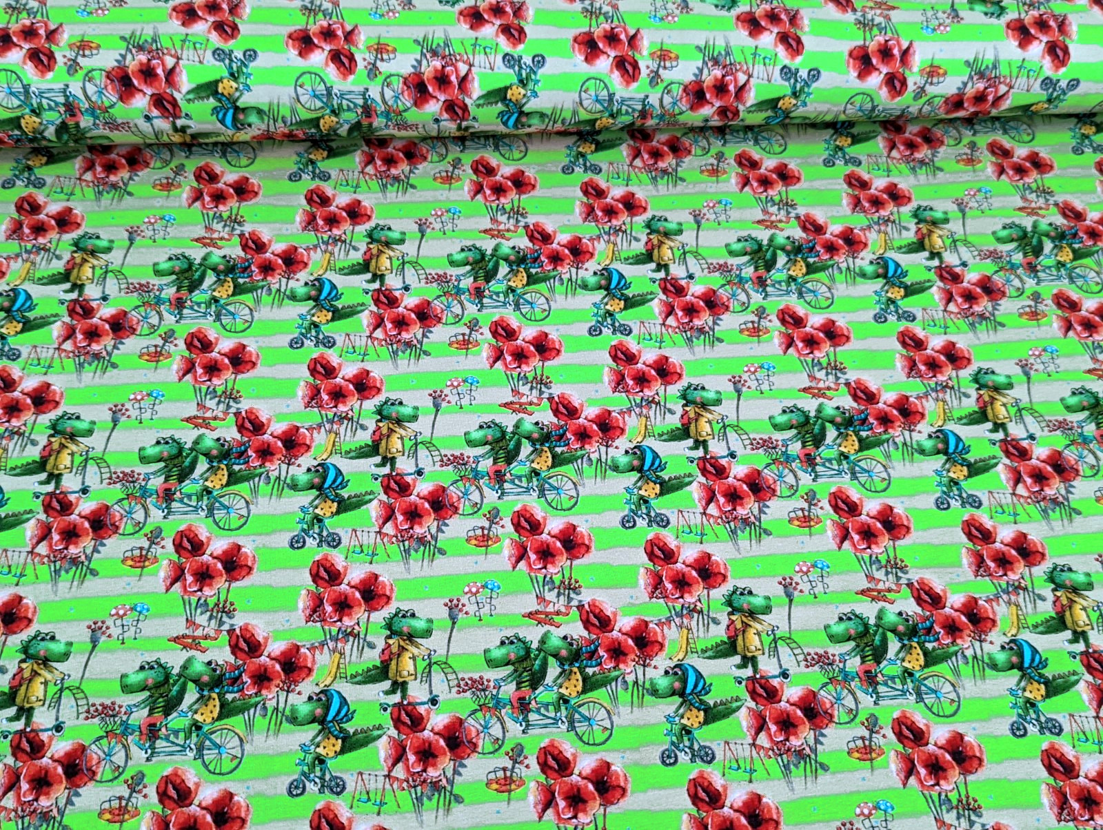 Baumwolljersey Krokodil Freunde in den Ferien Mohnblume Grün