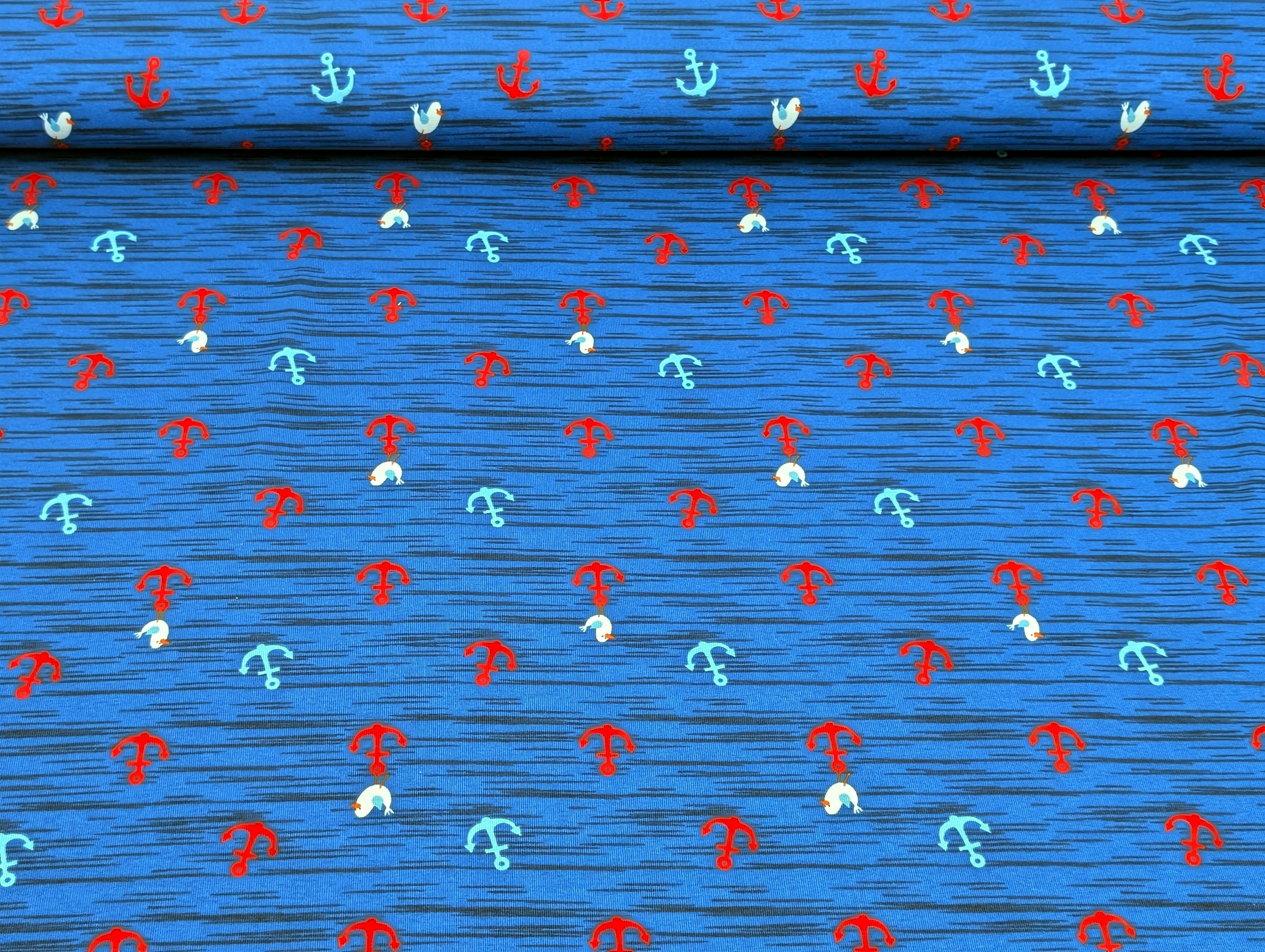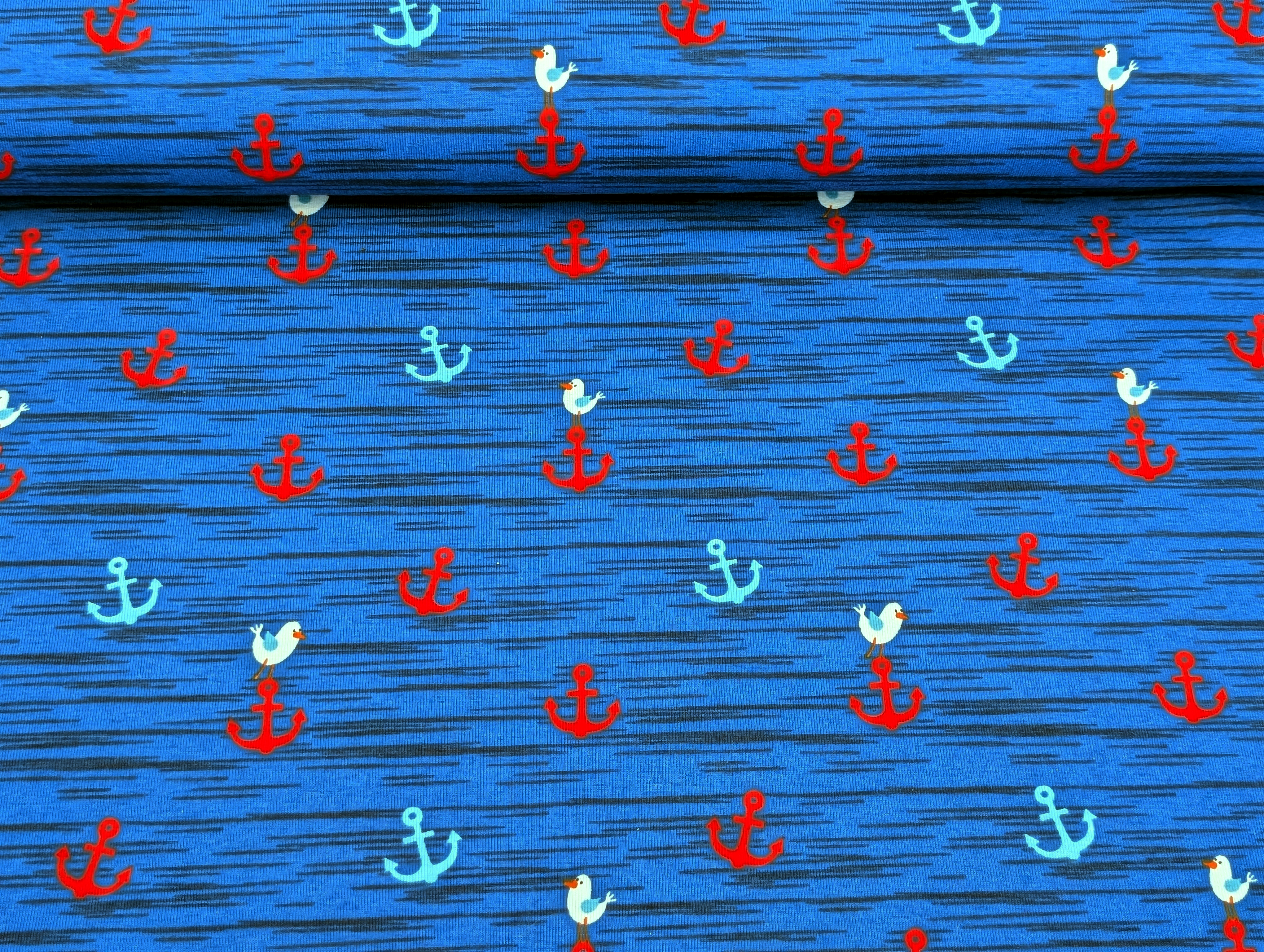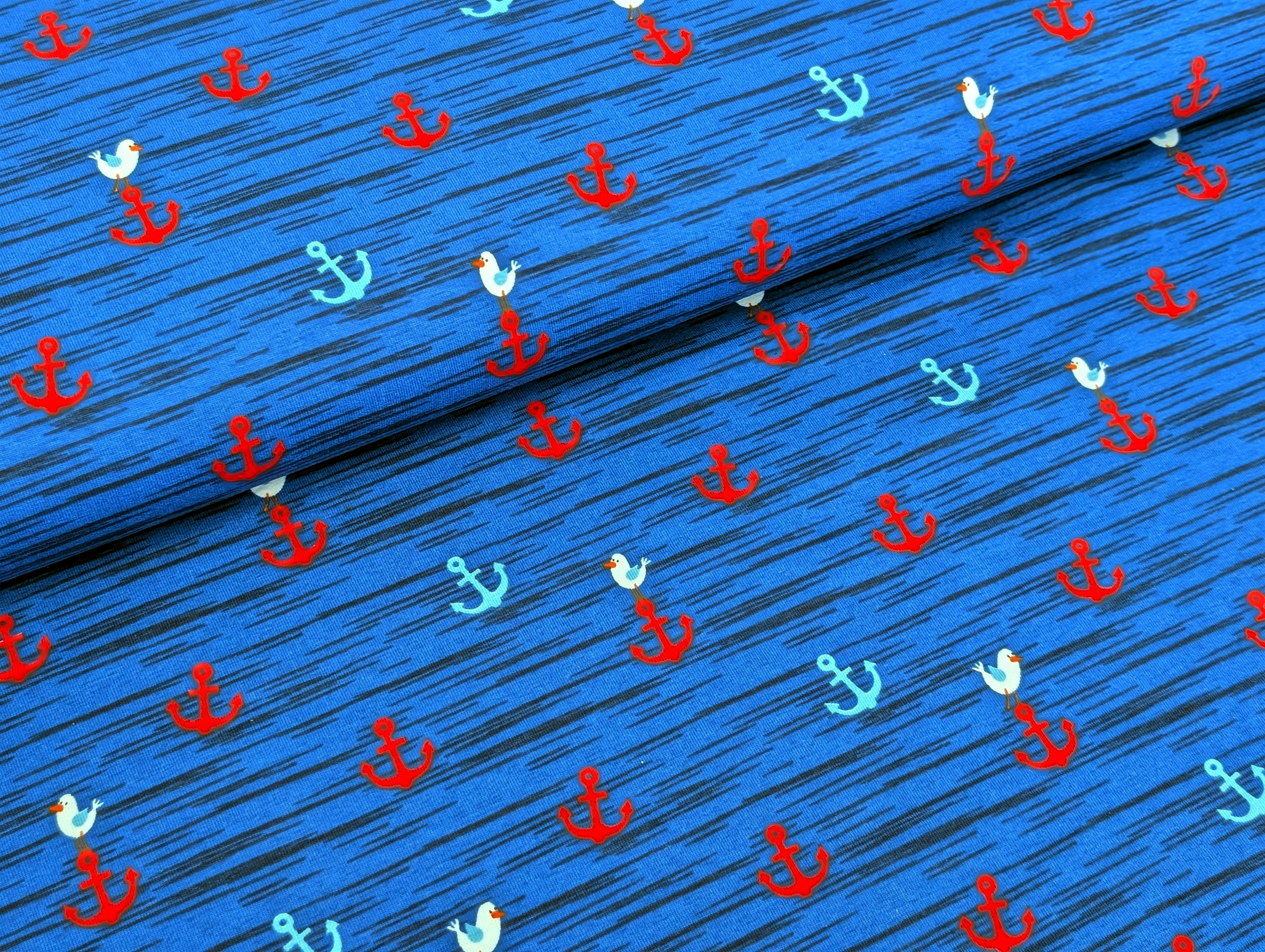 Mobile Preview: Baumwolljersey Möwen und Anker Indigoblau