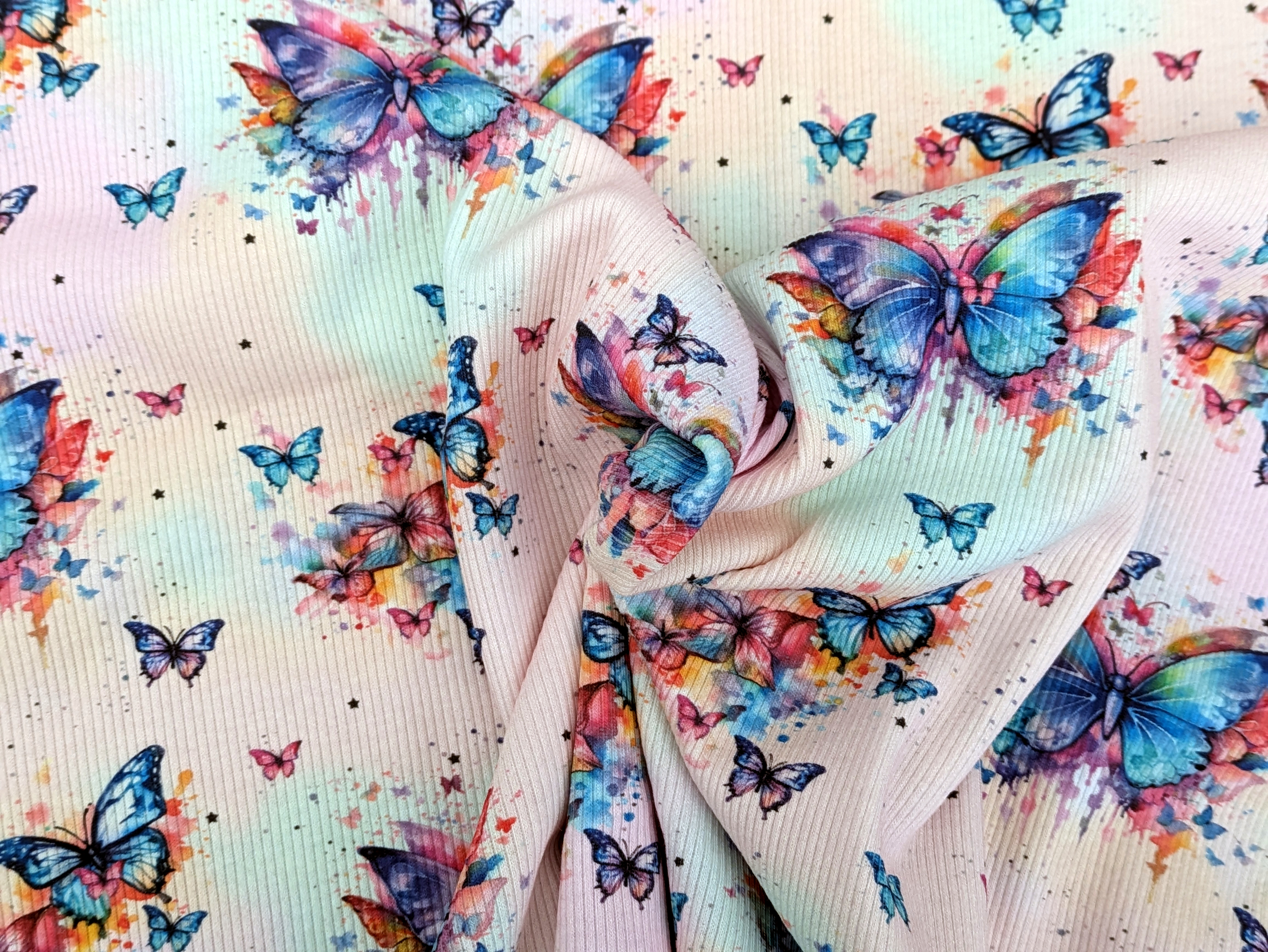 Eigenproduktion Rib Jersey Regenbogen Schmetterling auf Hellrosa
