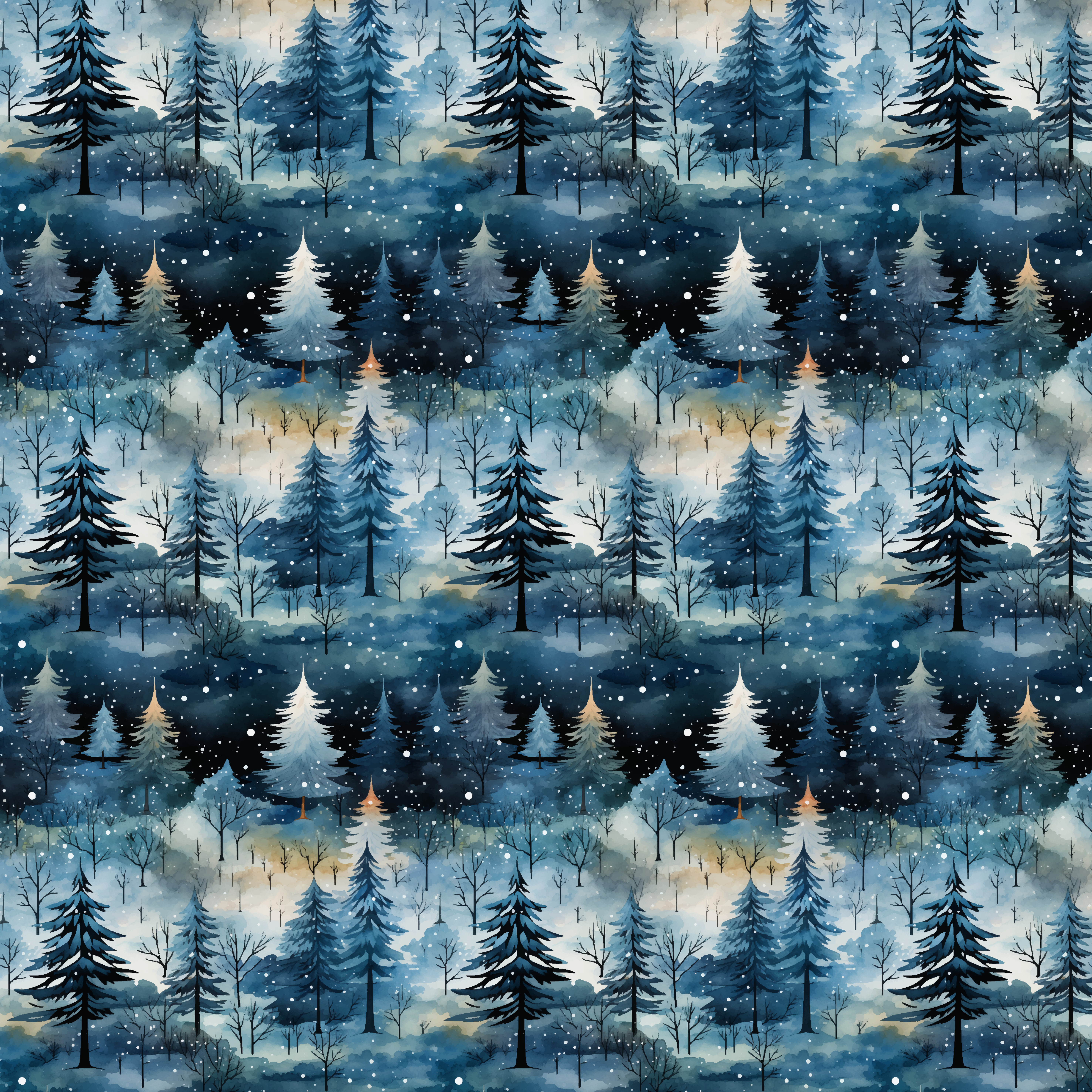 Eigenproduktion Aquarell Winterwald Schnee Bäume auf Blau